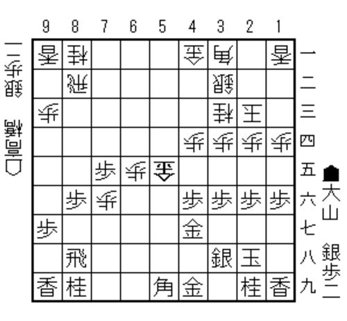 先手番大山先生の手を考えます。 第1問 後手に中央を制圧された感じですが、反撃を考えます。 A 58飛 B 37角 C 56銀 第2問 これでどうにか形になりました。 A 88銀 B 56金 C 56歩 第3問 ちょっと苦しいのですが手筋で粘ります。 A 69歩 B 47銀打 C 59飛 第4…