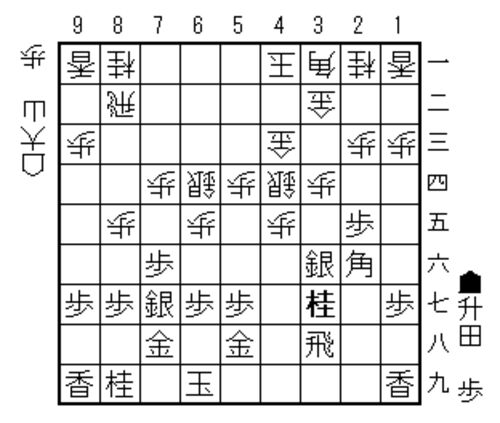 後手番大山先生の手を考えます。 第1問 先手に攻めの形を作られましたが、形勢は悪くありません。 A 75歩 B 55銀右 C 53角 第2問 受けの手はいくつか見えますが、これが一番良いようです。 A 35歩 B 45銀 C 46歩 第3問 この形は寄せがあるのです。手としては…
