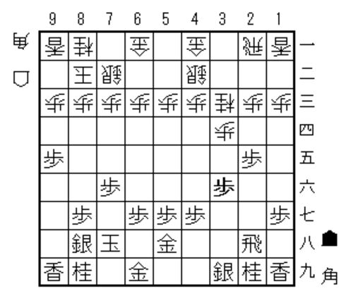 33角戦法の最後はこの図の「25桂ポン」対策の陣形から、 後手が持久戦を選ぶのですが、54歩を突くほうはどうか。54歩48銀53銀68金上42金 46歩84歩37桂74歩86歩83銀87銀72金47銀73桂77桂64銀29飛と穏やかに組んだ後で94歩 後手は有効な待ち手が少ないので端を…