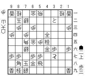 飛角が働かないので攻める手がないです。22歩~21歩成同飛というのもだめでしょう。3筋の歩を伸ばすくらいしかないとは。